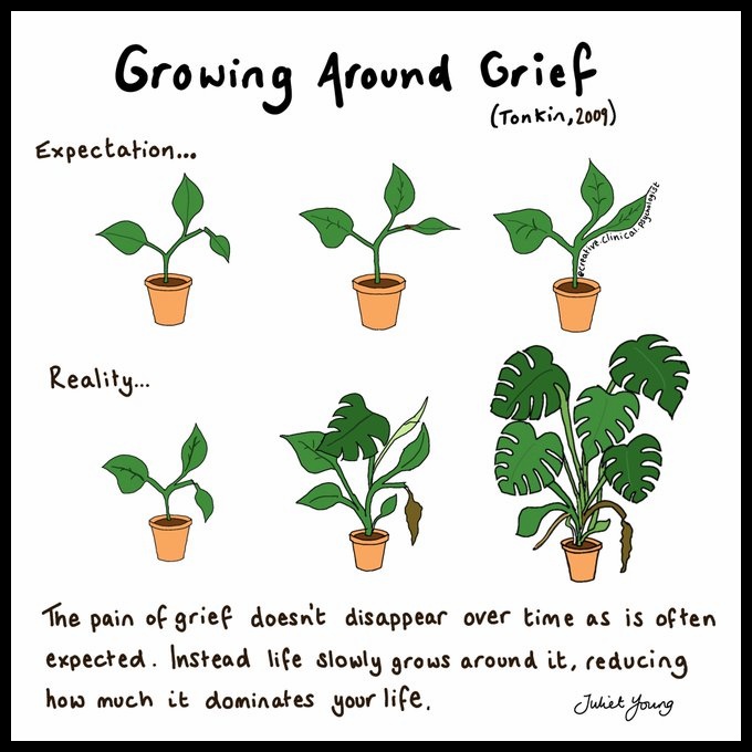 In fact, the bereavement journey enlarges us. We grow to incorporate our loss, to keep it safe and with us, yet we are free to function and move on.”